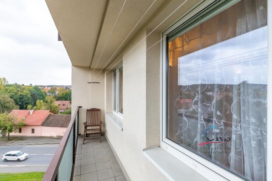 Prostorná lodžie přes celý obývací pokoj a ložnici, orientovaná na východní stranu.